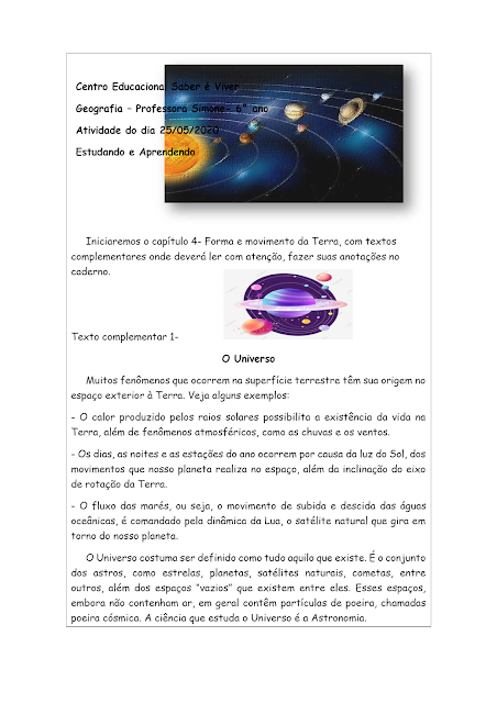 Blog criado para a turma do 6º ano do Ensino Fundamental do Centro Educacional Saber é Viver. Aqui serão colocadas conteúdos e atividades para os alunos.